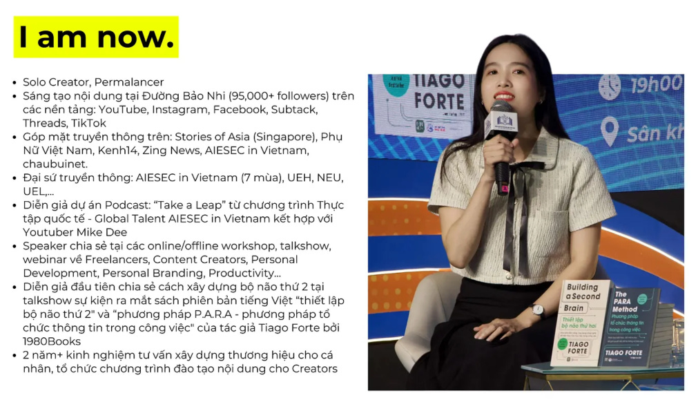 nơi đã cho mình cơ hội được tìm thấy kho báu vốn có của bản thân như đạt được hơn 95,000 người theo dõi trên đa nền tảng, với các cơ hội công việc, được truyền thông trên báo, làm diễn giả, làm trainer về THCN, dc gặp gỡ những ngừoi chất lượng, có sự công nhận bởi các bạn followers của mình.