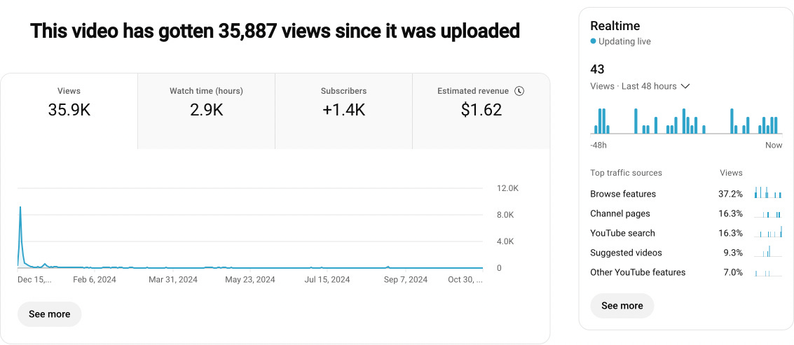 Trong đó, với video thứ 2 “Xây dựng bộ não thứ 2 | Kỹ năng hiệu suất năm 2024 | cách mình xây dựng bộ não thứ 2 trên Apple Note” mình đăng tải vào 15/12/2023, YouTube vẫn phân phối video này của mình cho đến hiện tại, và đây cũng là video có lượt xem nhiều nhất trên kênh của mình.