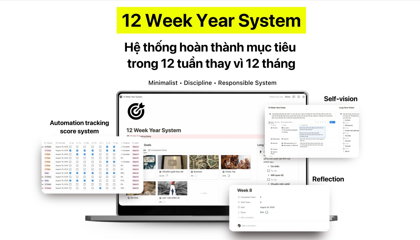 Nếu bạn là người quan tâm đến việc gia tăng hiệu suất x4 so với bình thường khi hành động cho mục tiêu, thì có thể tham khảo hệ thống hoàn thành mục tiêu trong 12 tuần thay vì 12 tháng (12 Week Year System) của mình: chi tiết tại đây